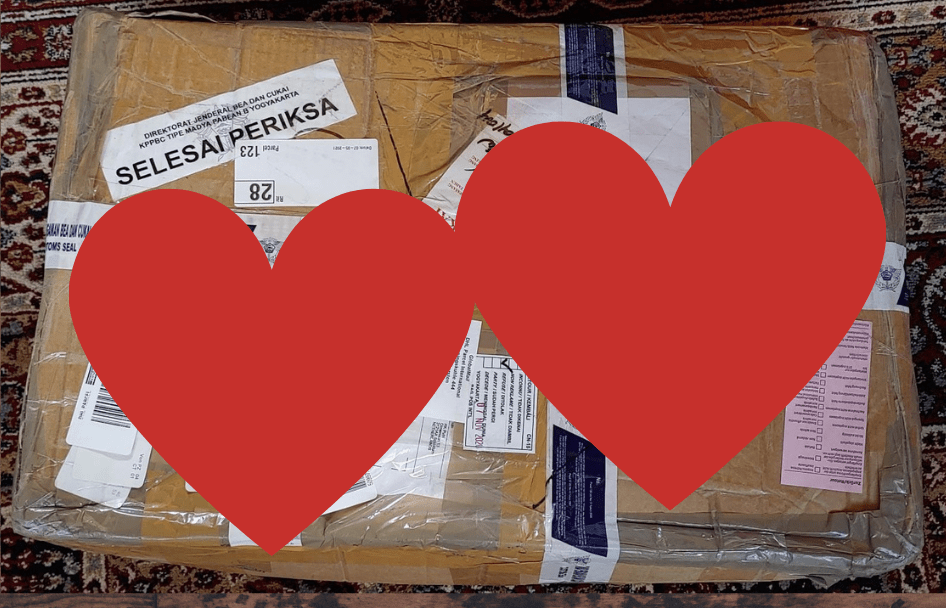 Dengan penampakan packing yang aku sendiri sudah lupa, apakah aku dulu packing barang seperti ini. Bahkan, saat paket ini datang, aku malah kaget karena hari ini tidak sedang menunggu kiriman apapun. Setelah menempuh perjalanan berbulan-bulan, kardusnya sampai penyok dan kotor 🙂